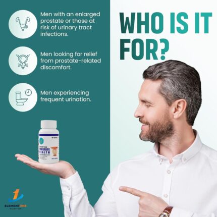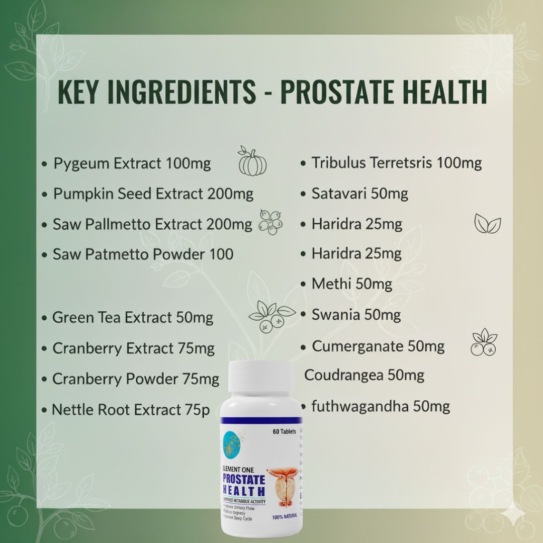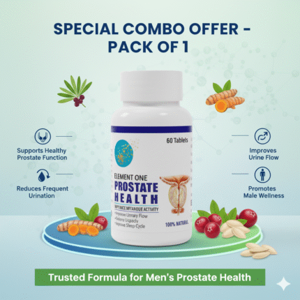 Experience the power of nature with Element One Prostate Health Support Care Formula, an advanced Ayurvedic formulation designed to promote optimal prostate health. This unique blend combines traditional wisdom with modern science, featuring potent extracts like Saw Palmetto, Cranberry, Pumpkin Seeds, Green Tea, Grape Seed, Gokhru, and Curcumin to support your prostate’s well-being.